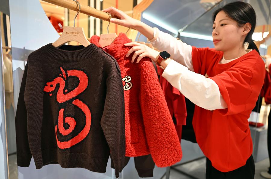 "The collection features the letter 'B' formed by a snake, symbolizing our brand. The red color fits well with the festive mood," said the salesperson Li Xin, adding that some sizes have already sold out.