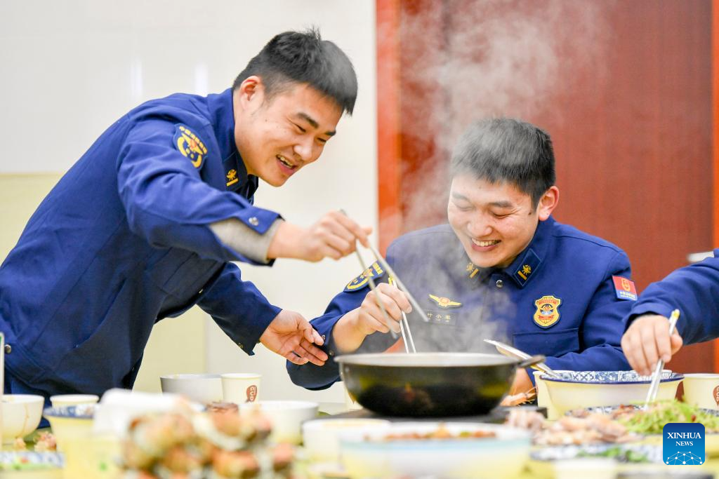 Firefighters have a meal at a fire station in Taizhou City, east China's Jiangsu Province, Jan. 28, 2025. Dining with family members in a reunion meal has been a cherished tradition for the Chinese on the eve of the Spring Festival, which falls on Jan. 29 this year. (Photo by Yang Yugang/Xinhua)