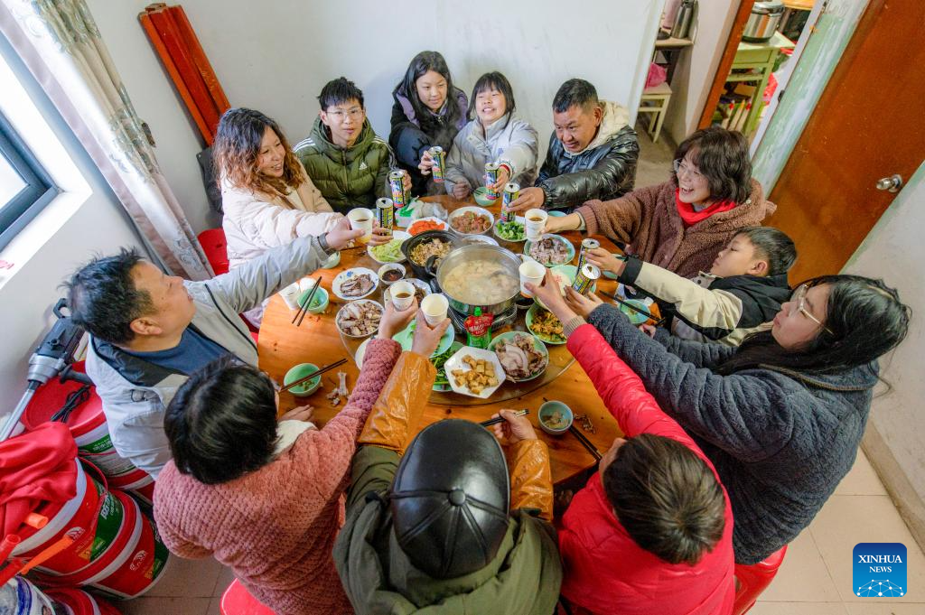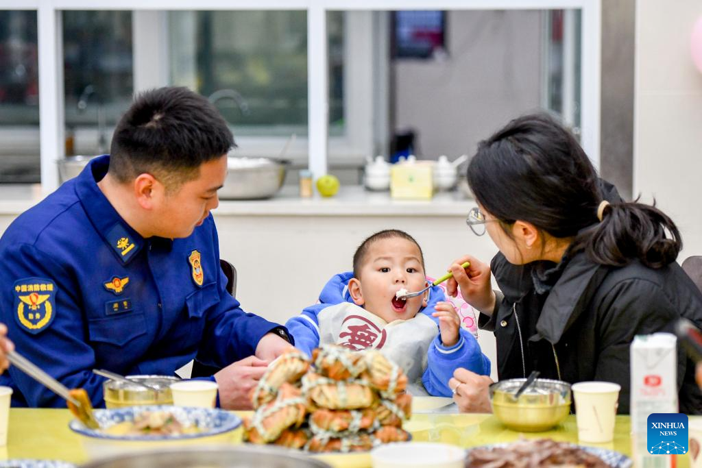 A firefighter has a reunion meal with his family members at a fire station in Taizhou City, east China's Jiangsu Province, Jan. 28, 2025. Dining with family members in a reunion meal has been a cherished tradition for the Chinese on the eve of the Spring Festival, which falls on Jan. 29 this year. (Photo by Yang Yugang/Xinhua)