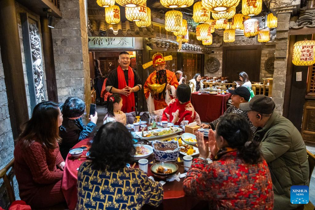 An actor in the costume of the God of Wealth extends greetings to customers at a restaurant in Nanjing City, east China's Jiangsu Province, Jan. 28, 2025. Dining with family members in a reunion meal has been a cherished tradition for the Chinese on the eve of the Spring Festival, which falls on Jan. 29 this year. (Photo by Zhang Meng/Xinhua)
