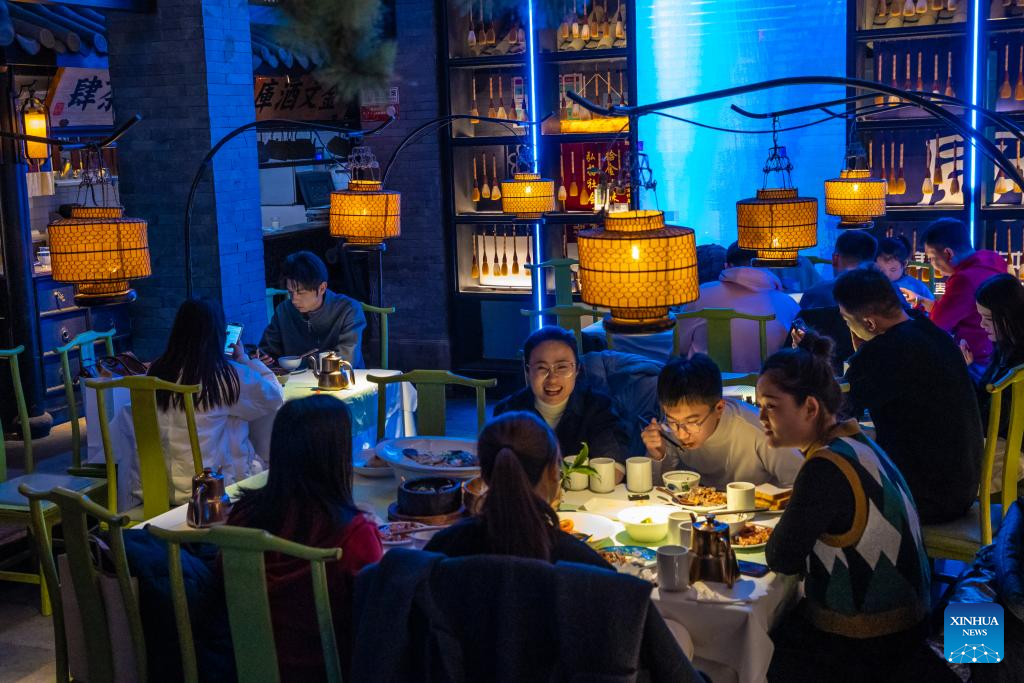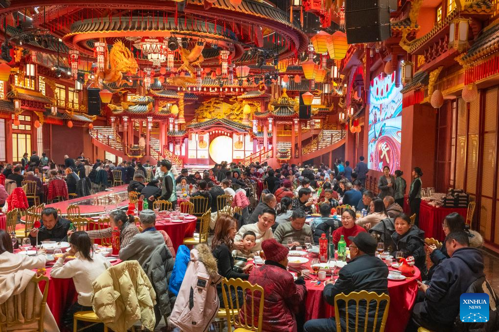 People have reunion meals at a restaurant in Nanjing City, east China's Jiangsu Province, Jan. 28, 2025. Dining with family members in a reunion meal has been a cherished tradition for the Chinese on the eve of the Spring Festival, which falls on Jan. 29 this year. (Photo by Zhang Meng/Xinhua)