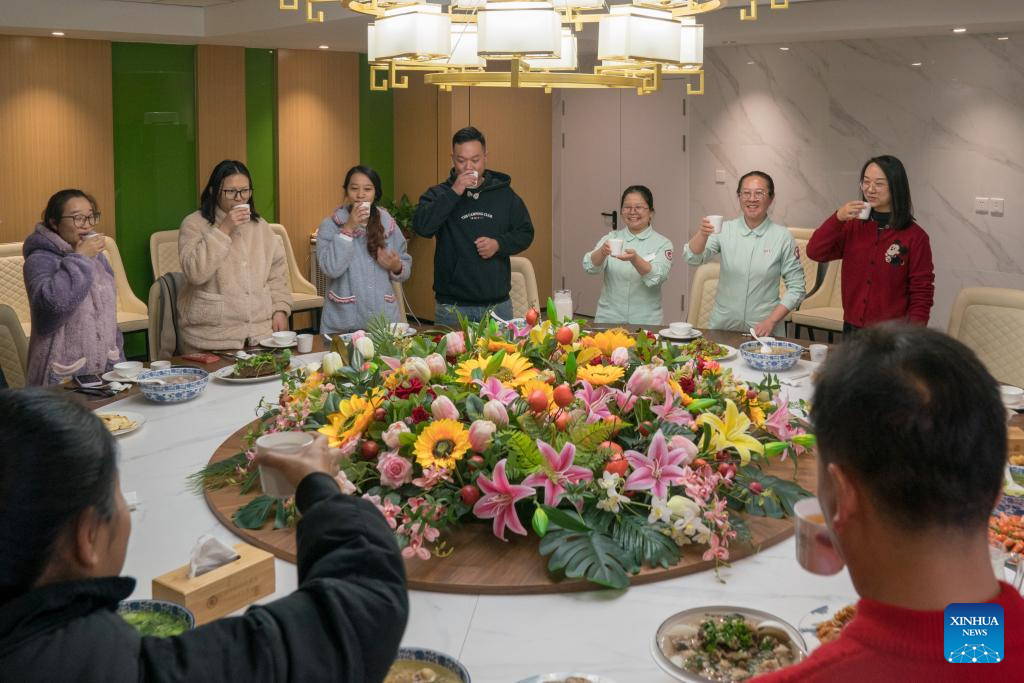 Families of newborns have a reunion meal with staff at the canteen of a maternal and child care service center in Honghe Hani and Yi Autonomous Prefecture, southwest China's Yunnan Province, Jan. 28, 2025. Dining with family members in a reunion meal has been a cherished tradition for the Chinese on the eve of the Spring Festival, which falls on Jan. 29 this year. (Photo by Peng Yikai/Xinhua)