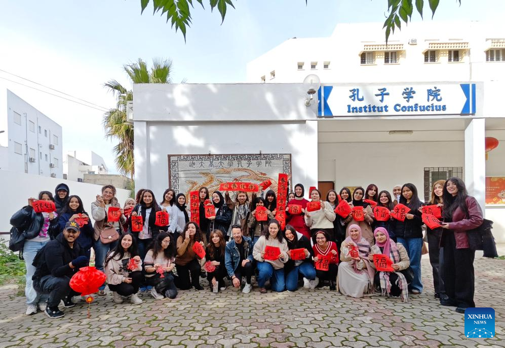 Students majoring in Chinese language and teachers of the Confucius Institute at Carthage University pose for a photo during a cultural event in celebration of the Spring Festival in Tunis, Tunisia, Jan. 27, 2025. (Photo by Adel Ezzine/Xinhua)
