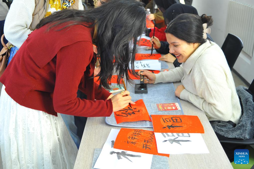 Students majoring in Chinese language write the Chinese character "Fu," meaning "good fortune," during a cultural event held by the Confucius Institute at Carthage University in celebration of the Spring Festival in Tunis, Tunisia, Jan. 27, 2025. (Photo by Adel Ezzine/Xinhua)