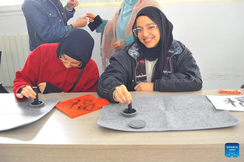 Students majoring in Chinese language prepare ink to write the Chinese character "Fu," meaning "good fortune," during a cultural event held by the Confucius Institute at Carthage University in celebration of the Spring Festival in Tunis, Tunisia, Jan. 27, 2025. (Photo by Adel Ezzine/Xinhua)