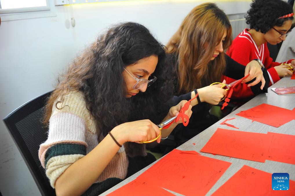 Students majoring in Chinese language learn Chinese papercutting during a cultural event held by the Confucius Institute at Carthage University in celebration of the Spring Festival in Tunis, Tunisia, Jan. 27, 2025. (Photo by Adel Ezzine/Xinhua)