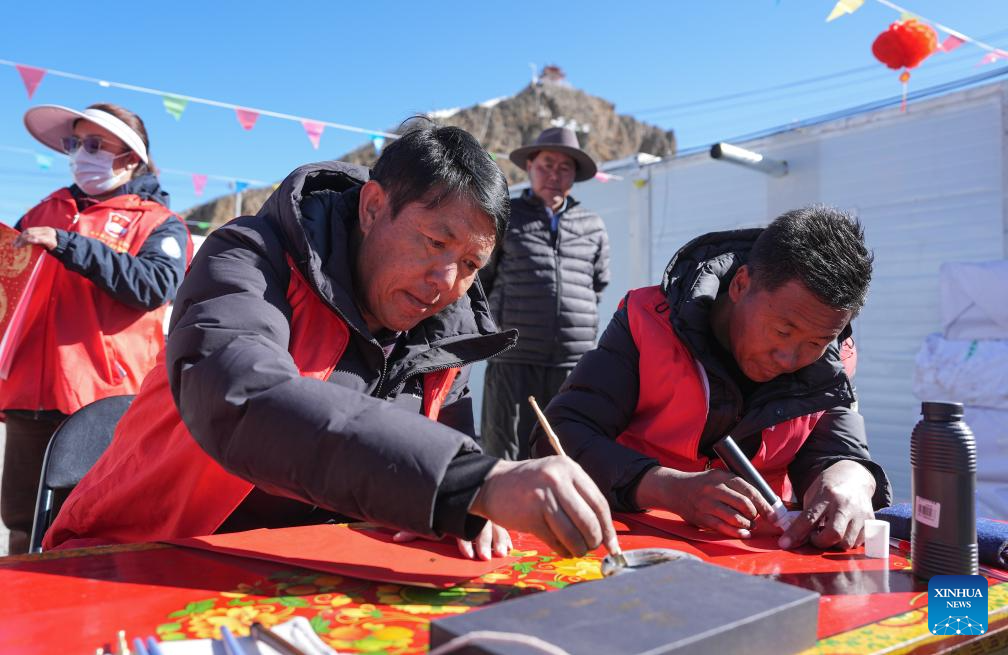 Volunteers write Spring Festival couplets at a temporary shelter in Gyiru Village, Lnaze County of southwest China's Xizang Autonomous Region, Jan. 26, 2025.