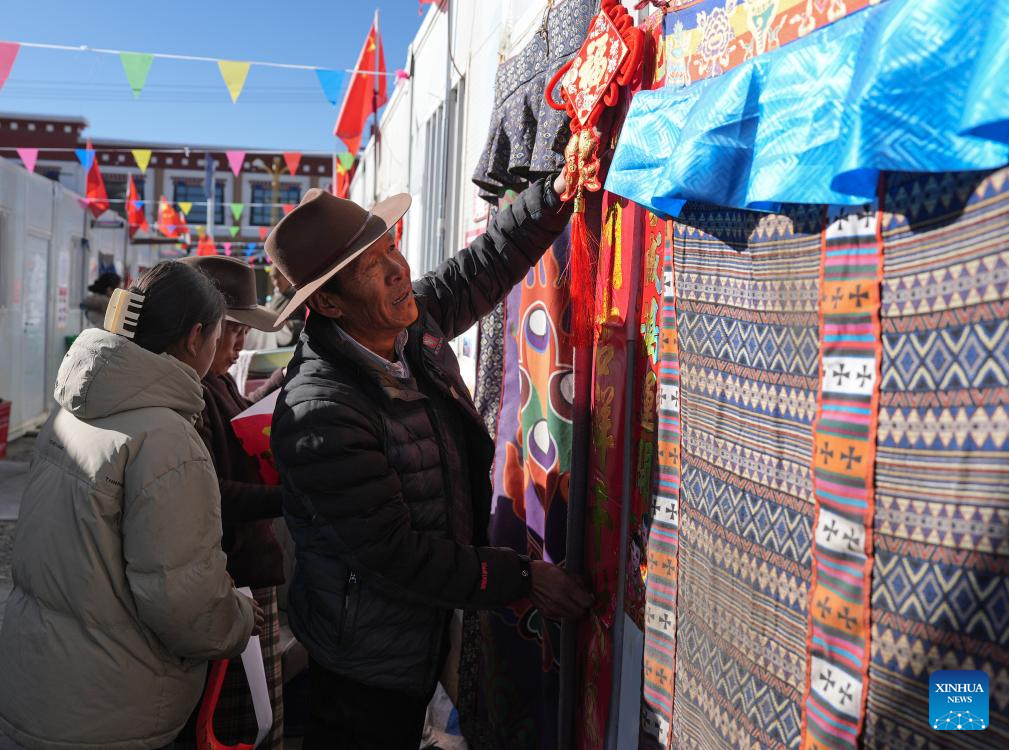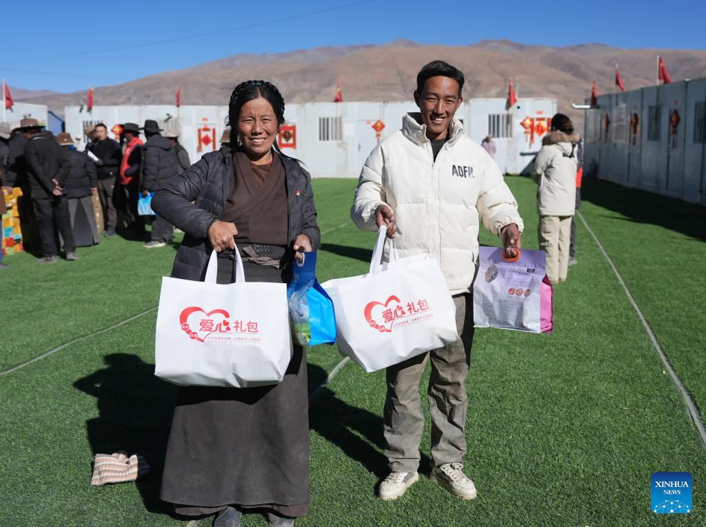 Lnaze County is one of the counties affected seriously by a 6.8-magnitude earthquake which struck southwest China's Xizang earlier this month. As the Chinese Lunar New Year and Tibetan New Year approach, people in the affected area moved into newly constructed makeshift houses and received food packages with beef, tea leaves, sugar, highland barley wine, etc. As relief efforts continue and life gradually returns to normal, affected people feel the warmth and support pouring in from all directions. (Xinhua/Jigme Dorje)