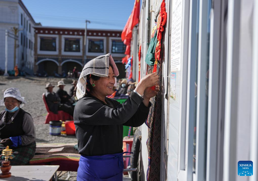 A woman hangs festive decoration at a temporary shelter in Gyiru Village, Lnaze County of southwest China's Xizang Autonomous Region, Jan. 26, 2025.