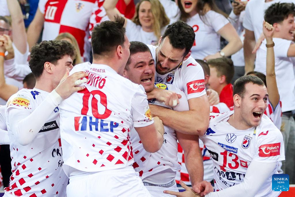 Players of Croatia celebrate victory after the 2025 IHF Men's Handball World Championship quarterfinal between Croatia and Hungary in Zagreb, Croatia, Jan. 28, 2025. (Sanjin Strukic/PIXSELL via Xinhua)