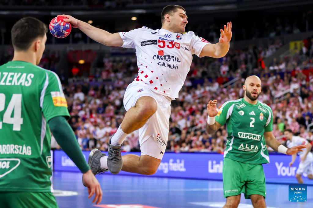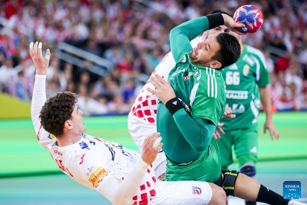 Bence Banhidi (R) of Hungary shoots during the 2025 IHF Men's Handball World Championship quarterfinal between Croatia and Hungary in Zagreb, Croatia, Jan. 28, 2025. (Sanjin Strukic/PIXSELL via Xinhua)