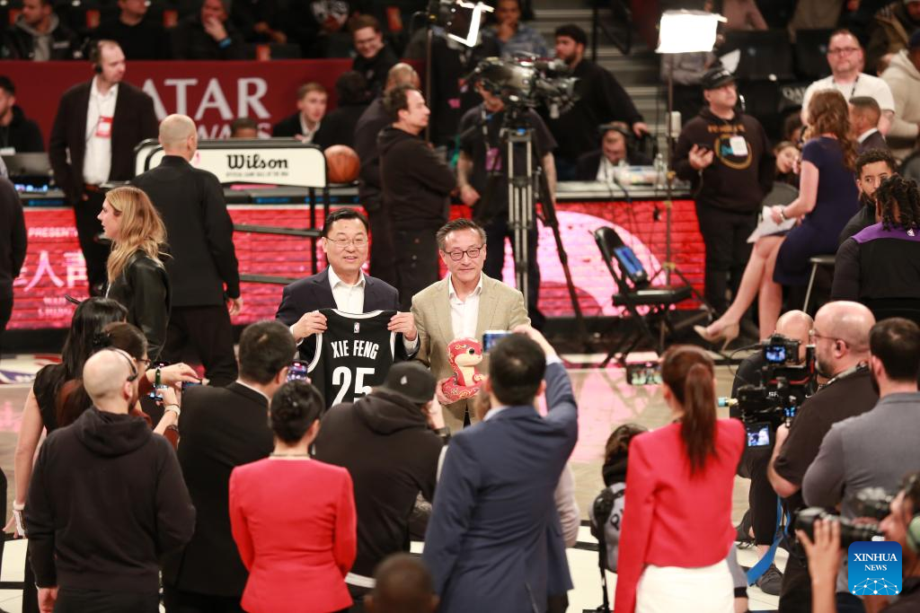 Chinese Ambassador to the United States Xie Feng (C-L) and Joseph Tsai (C-R), the owner of the Brooklyn Nets, exchange gifts prior to the tip-off of the Chinese New Year celebration game at Barclays Center in New York, the United States, on Jan. 27, 2025. Brooklyn Nets, the basketball team based in the New York City borough of Brooklyn, presented its yearly Chinese New Year celebration game Monday night playing against the Sacramento Kings. (Xinhua/Liu Yanan)