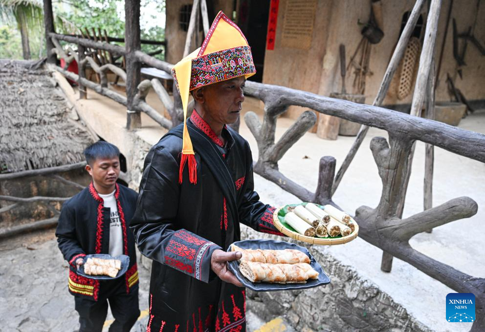 This photo taken on Jan. 28, 2025 shows rolls made from sticky rice and coconuts at Binglanggu tourism area in Baoting Li and Miao Autonomous County, south China's Hainan Province. An event featuring Li ethnic group culture was held at Binglanggu tourism area to celebrate the Chinese New Year, where tourists could dress in traditional Li attire and taste food with Li characteristics. (Xinhua/Pu Xiaoxu)