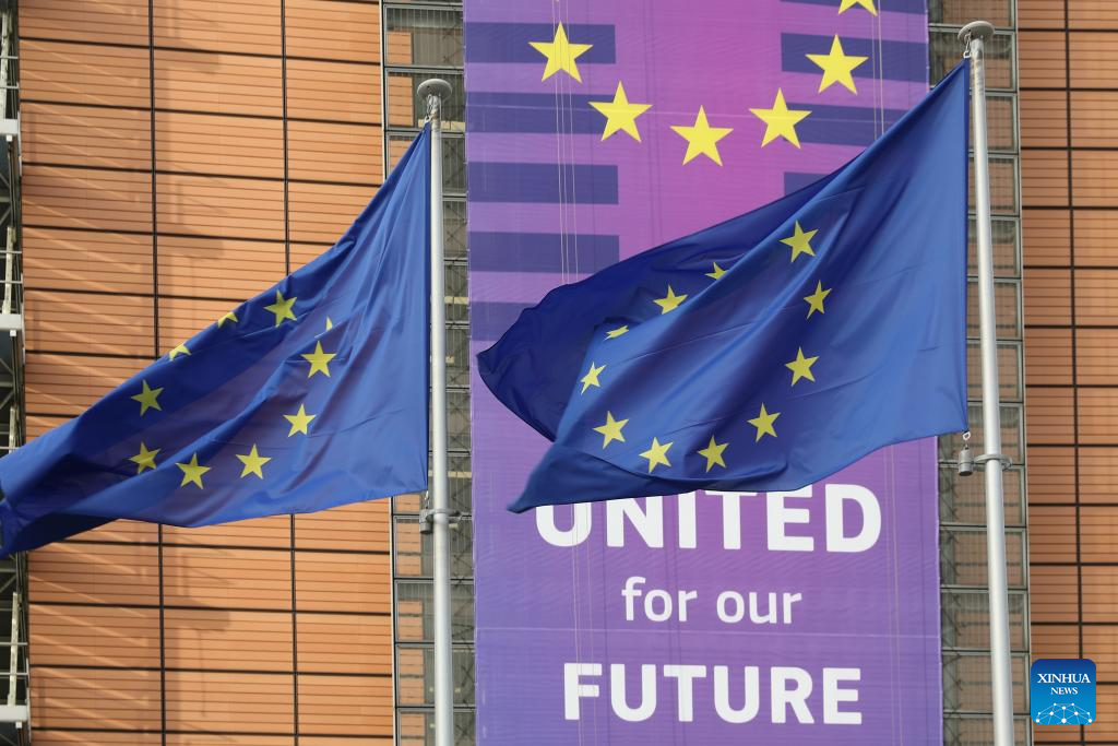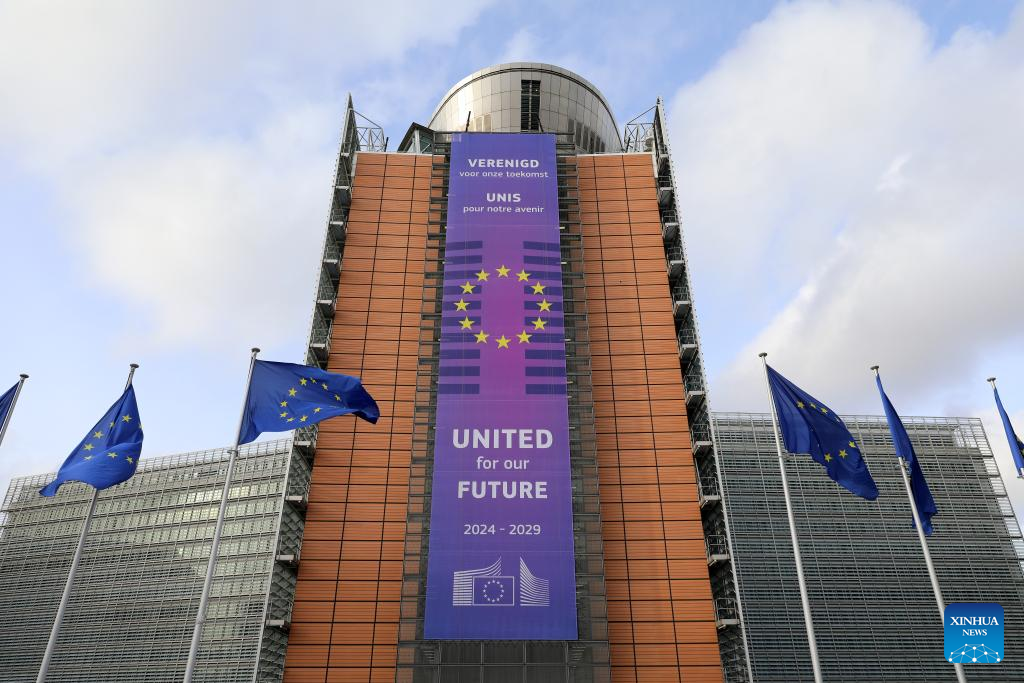 Flags of the European Union fly outside the Berlaymont Building, the European Commission headquarters, in Brussels, Belgium, Jan. 29, 2025. (Xinhua/Meng Dingbo)