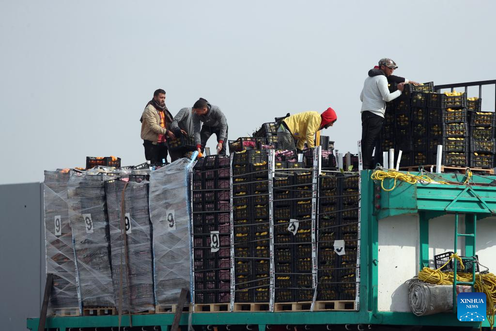 RAFAH, Egypt, Jan. 30 (Xinhua) -- Mohamed Ragab stood among crates of wilted fruits and vegetables, his frustration palpable: The 28-year-old truck driver has just completed the exhausting process of unloading his vehicle yet again, only to watch the perishable cargo spoil after being held for 72 hours by the Israeli side.