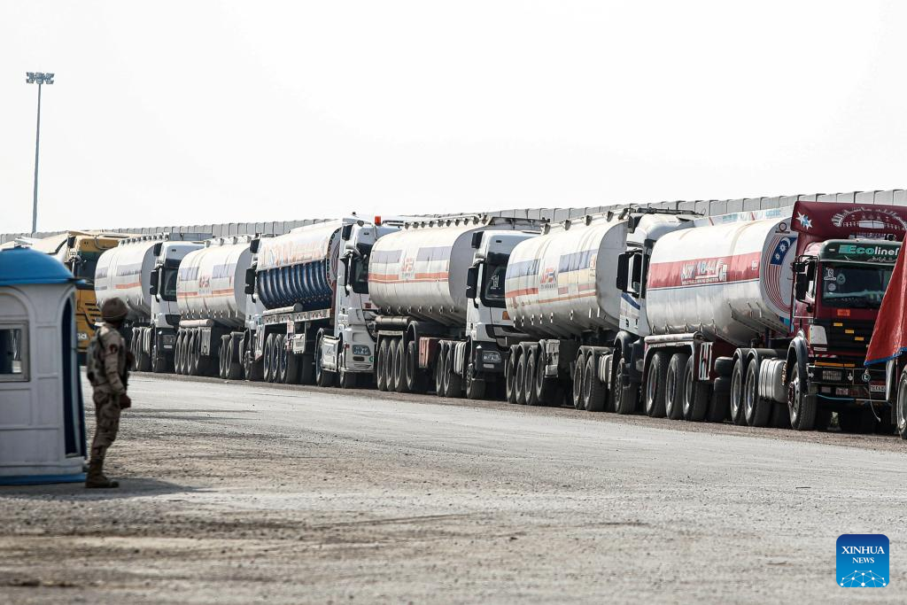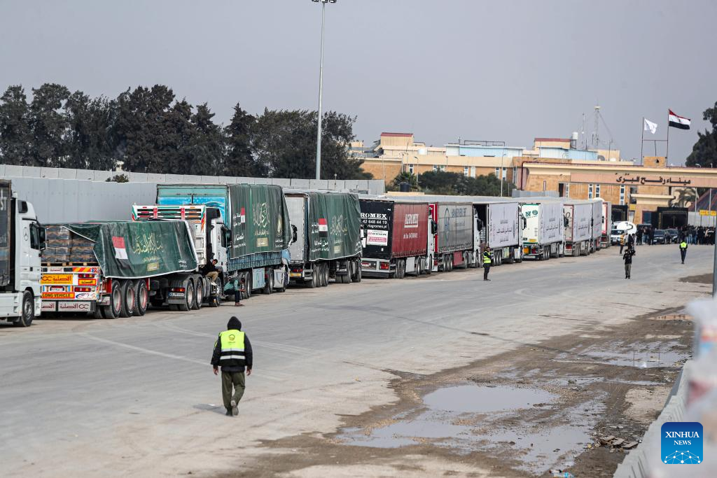 Aid trucks wait to enter Gaza on the Egyptian side of the Rafah crossing on Jan. 28, 2025. (Xinhua/Ahmed Gomaa)