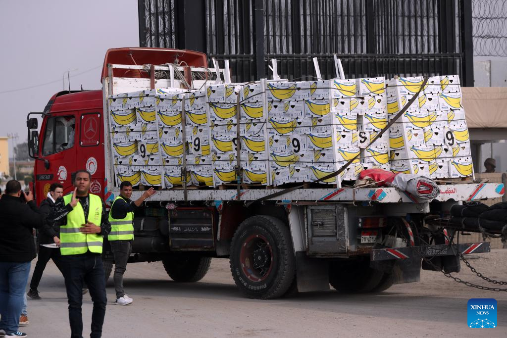 People load fruits and vegetables to be delivered to Gaza on the Egyptian side of the Rafah crossing on Jan. 28, 2025. (Xinhua/Ahmed Gomaa)