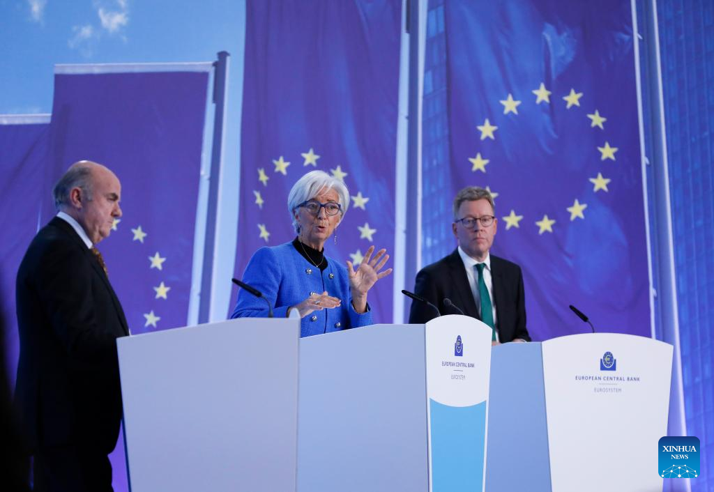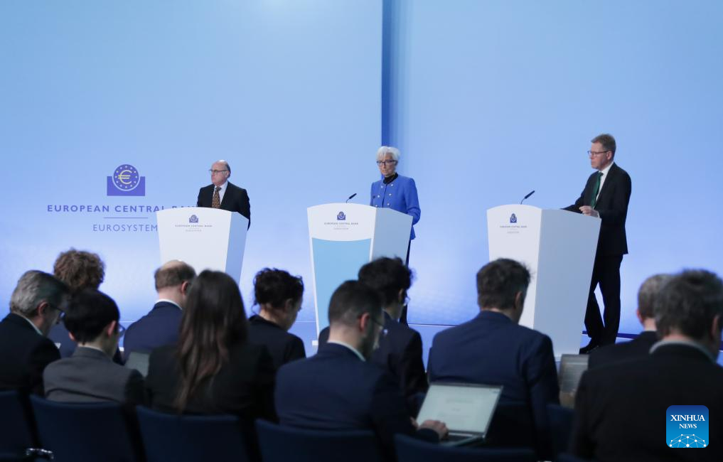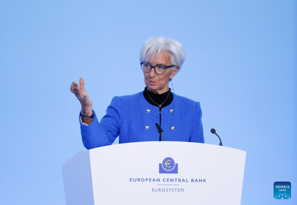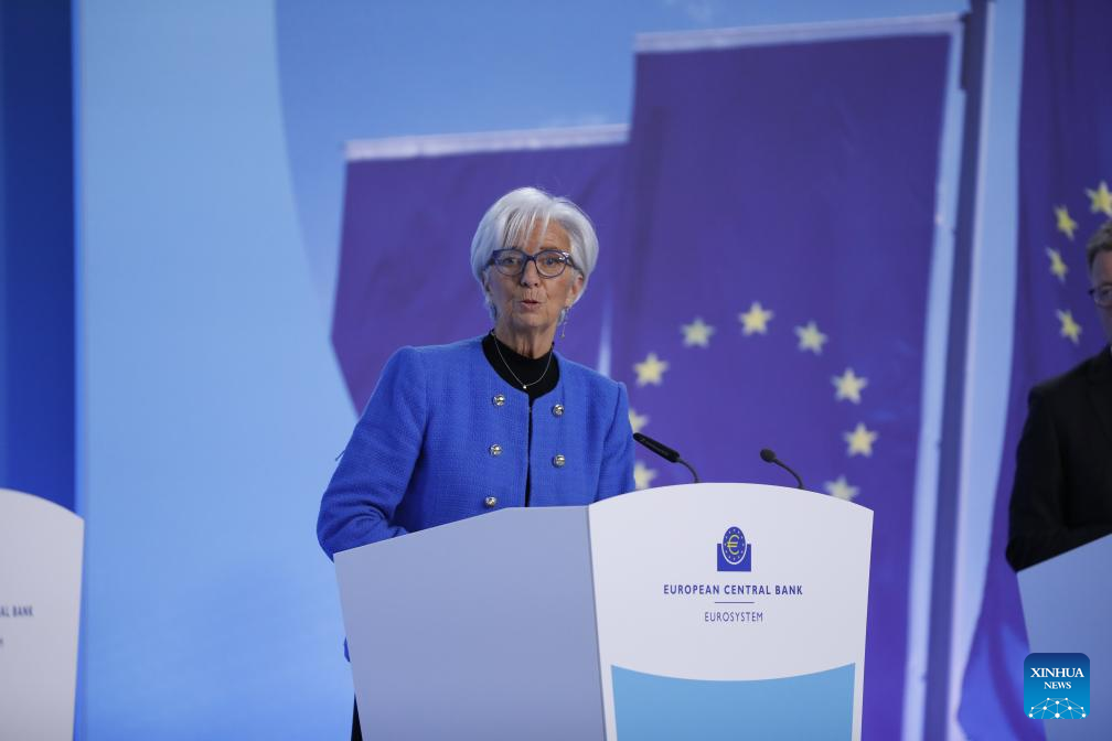 European Central Bank (ECB) President Christine Lagarde (C) speaks during a press conference at the ECB headquarters in Frankfurt, Germany, Jan. 30, 2025. The ECB on Thursday decided to lower key interest rates by 25 basis points. (Xinhua/Zhang Fan)