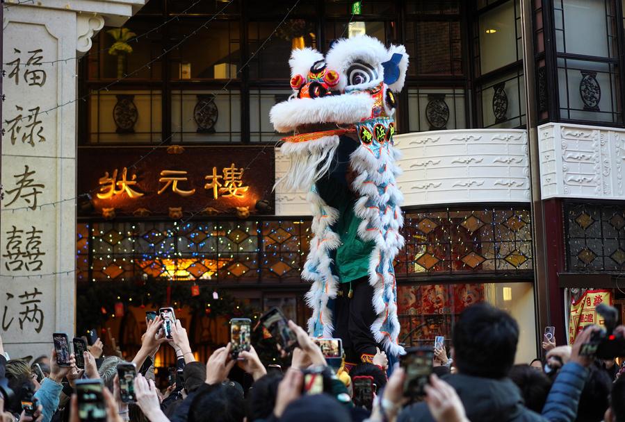 TOKYO, Jan. 31 (Xinhua) -- Amid the sounds of firecrackers and drums, a blue-and-white lion danced to the rhythm of the beat, gracefully moving its head to interact with the engaged audience in Japan's Yokohama Chinatown.