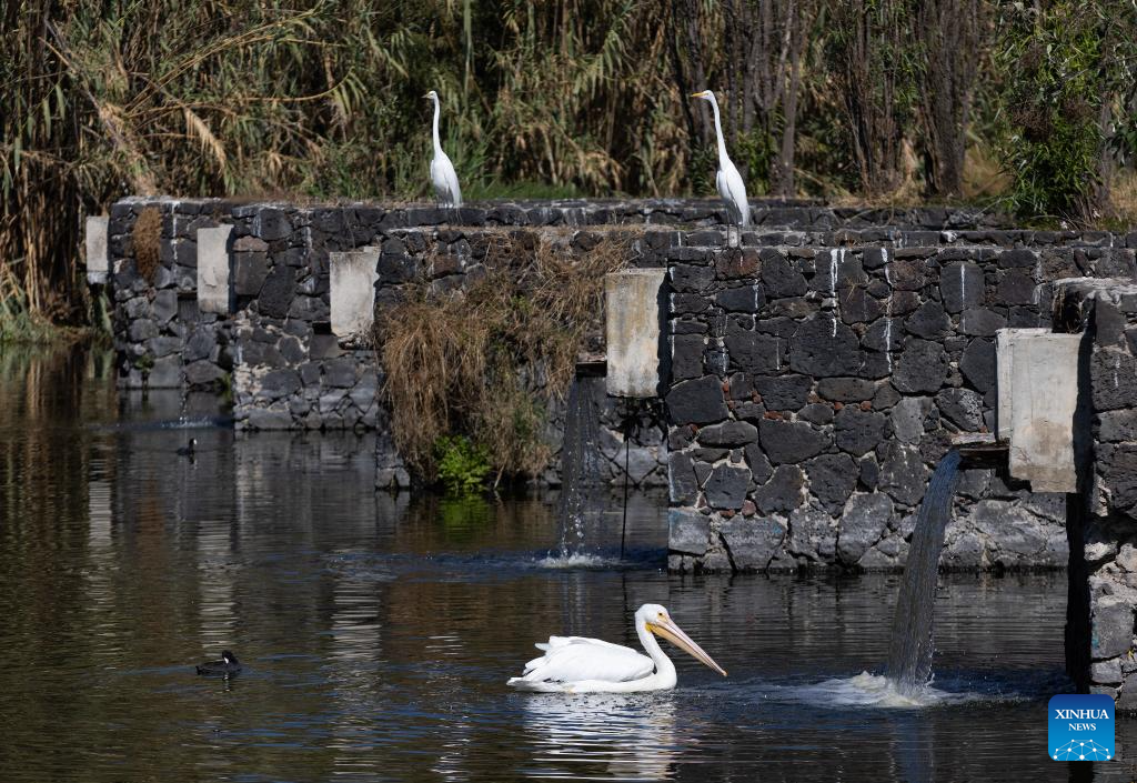 This photo taken on Jan. 30, 2025 shows a pelican and two white herons in Xochimilco, Mexico City, capital of Mexico. "Xochimilco" means "the land of flowers." It was included in the World Heritage List by the United Nations Educational, Scientific and Cultural Organization (UNESCO) in 1987. The network of canals and artificial islands here show the lifestyle of the Aztecs. Besides picturesque landscape, it is also home to various animals such as white herons, pelicans, and axolotls. (Xinhua/Li Mengxin)