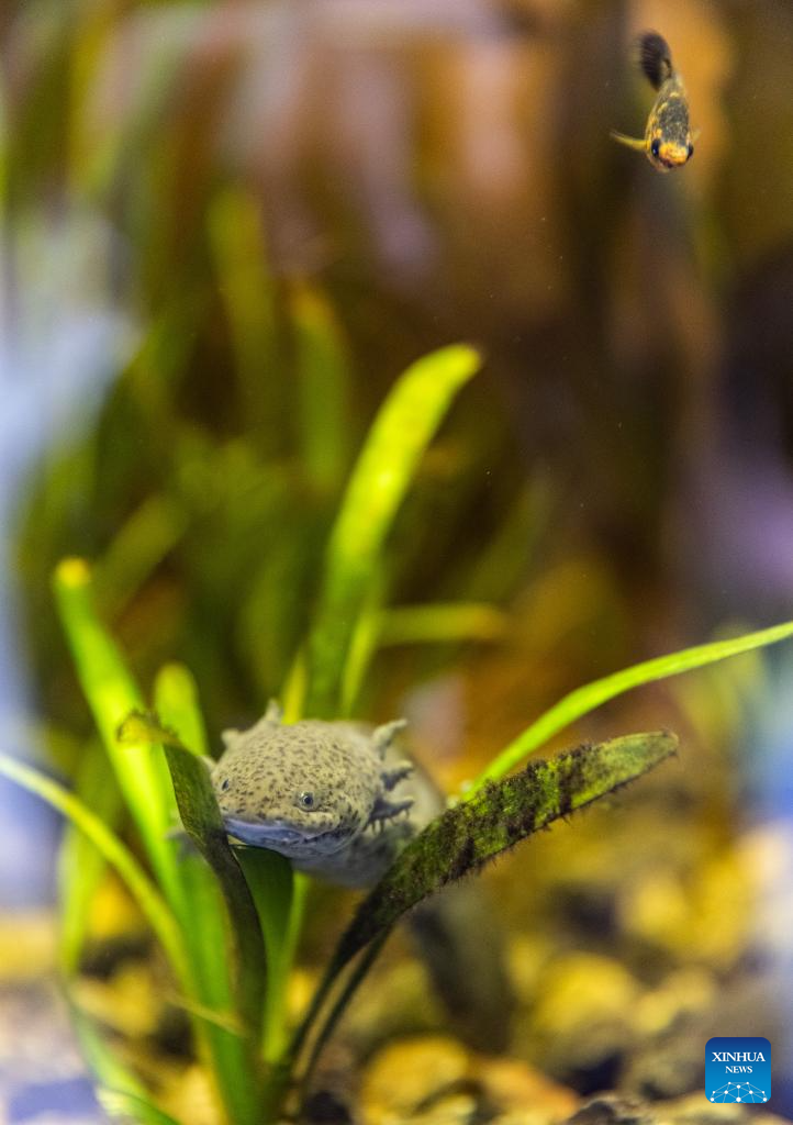 This photo taken on Jan. 30, 2025 shows an axolotl in Xochimilco, Mexico City, capital of Mexico. "Xochimilco" means "the land of flowers." It was included in the World Heritage List by the United Nations Educational, Scientific and Cultural Organization (UNESCO) in 1987. The network of canals and artificial islands here show the lifestyle of the Aztecs. Besides picturesque landscape, it is also home to various animals such as white herons, pelicans, and axolotls. (Xinhua/Li Mengxin)
