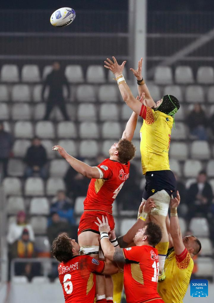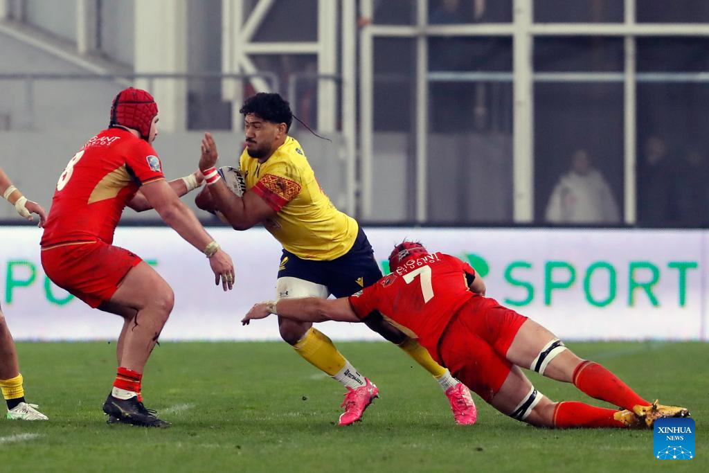 Romania's Adrian Mitu (C) competes during the pool B group match between Romania and Germany at the Rugby Europe Men's Championship 2025 at Arcul de Triumf stadium in Bucharest, Romania, Jan. 31, 2025. (Photo by Cristian Cristel/Xinhua)
