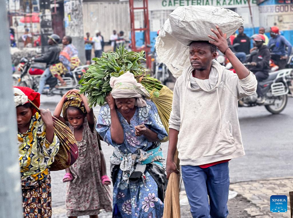 This phone taken with a mobile phone on Feb. 1, 2025 shows vendors walking with their produces at a street market in Goma, North Kivu Province, Democratic Republic of the Congo (DRC). (Photo by Zanem Nety Zaidi/Xinhua)