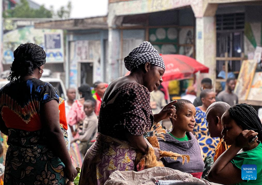 This phone taken with a mobile phone on Feb. 1, 2025 shows vendors selling chicken at a street market in Goma, North Kivu Province, Democratic Republic of the Congo (DRC). (Photo by Zanem Nety Zaidi/Xinhua)