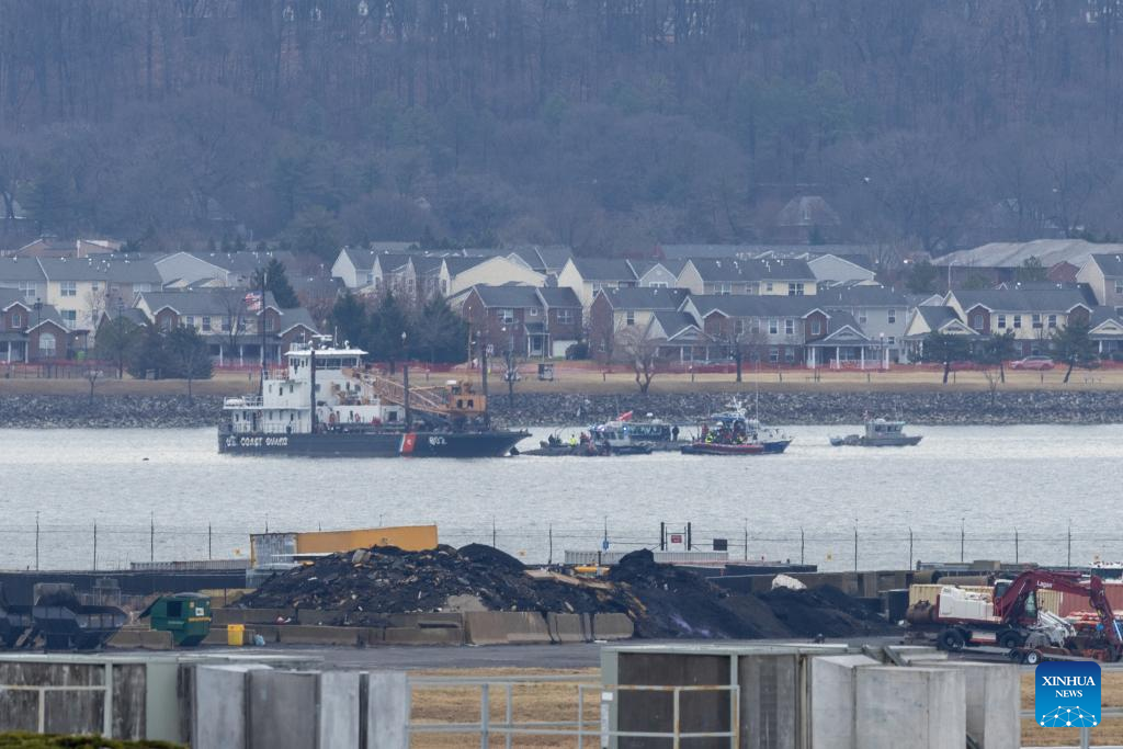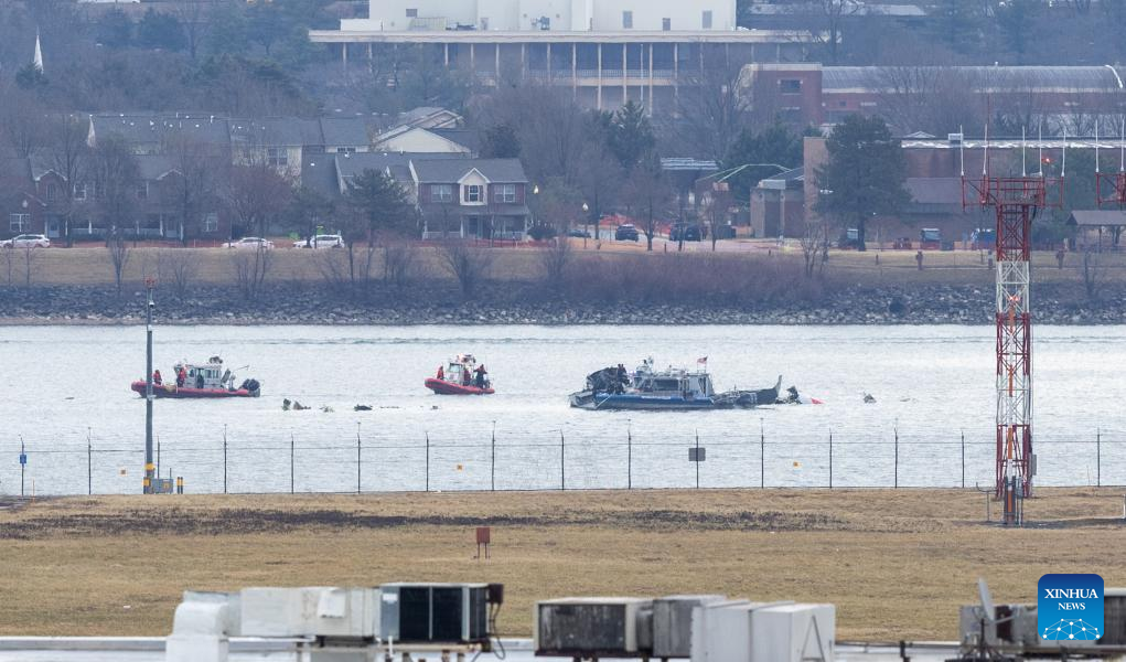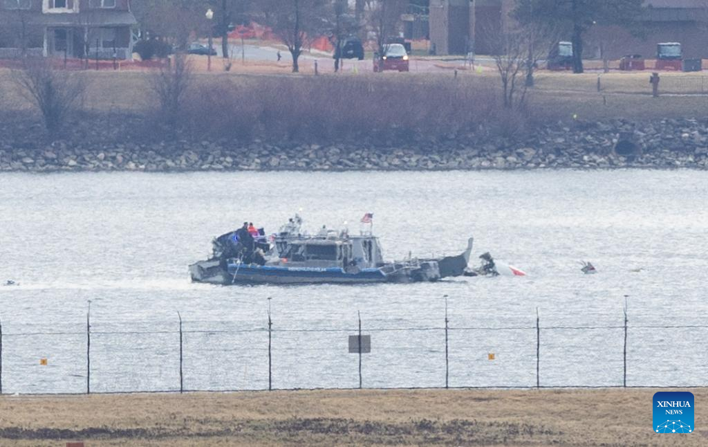Search efforts are underway at the wreckage site of a fatal midair collision between an American Airlines plane and a military helicopter in the Potomac River near Ronald Reagan Washington National Airport, Arlington, Virginia, the United States, Jan. 31, 2025. U.S. President Donald Trump said on social media Friday that the Black Hawk helicopter was "flying too high" when it collided with a passenger jet that was approaching the runway at the Reagan National Airport Wednesday night. (Xinhua/Hu Yousong)