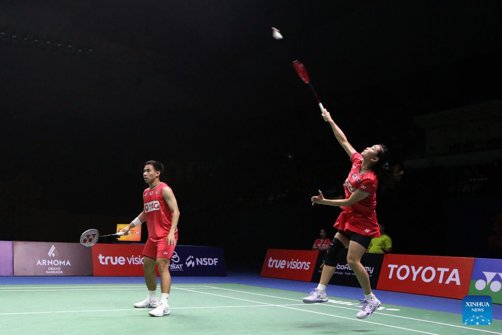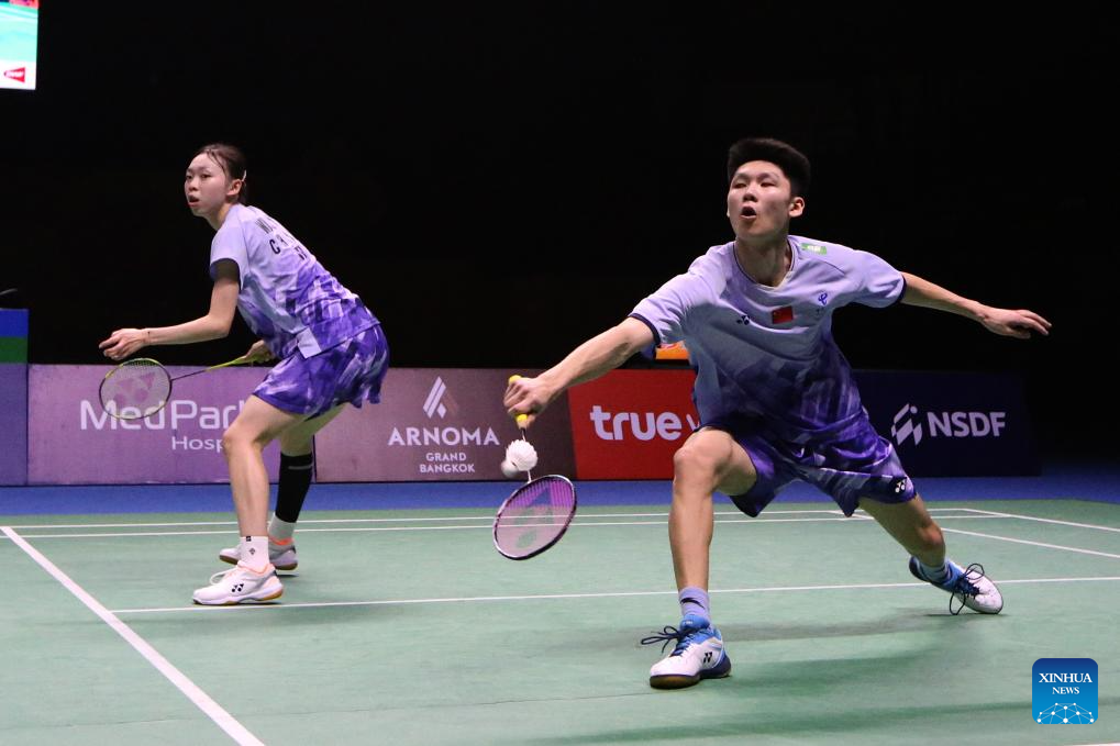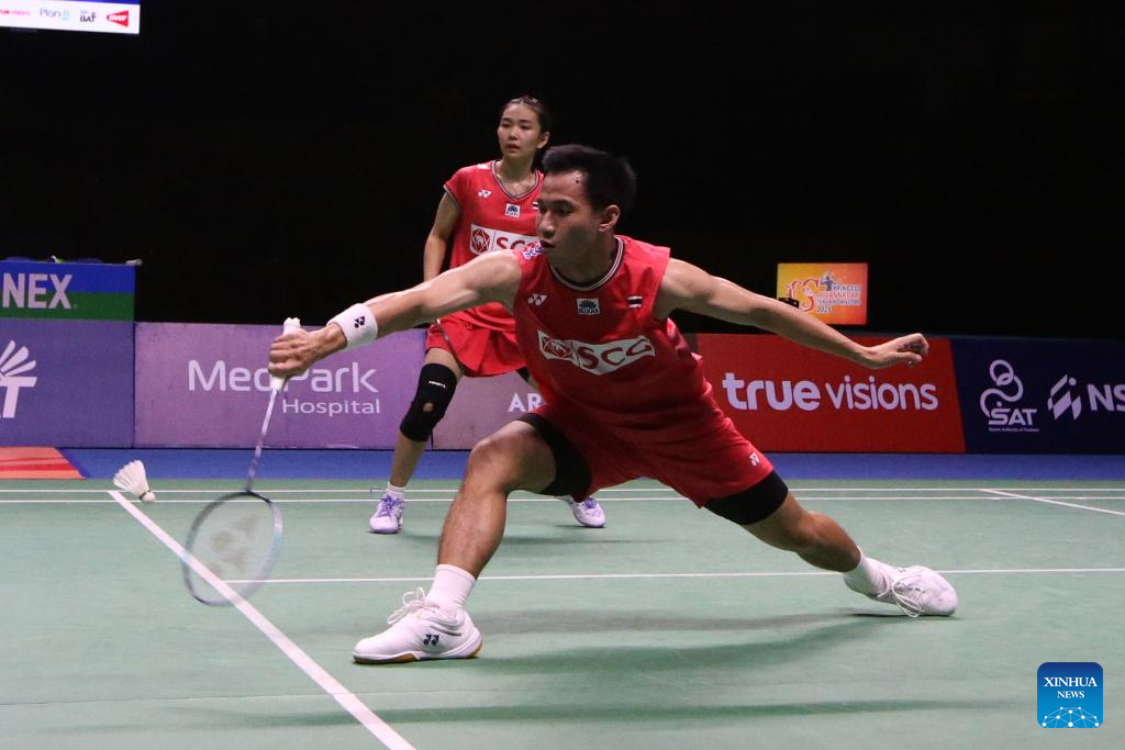 Dechapol Puavaranukroh (R)/Supissara Paewsampran of Thailand return a shot to Gao Jiaxuan/Wu Mengying of China during the mixed doubles semi final match at the BWF Thailand Masters 2025 badminton tournament in Bangkok, Thailand, Feb. 1, 2025. (Xinhua/Rachen Sageamsak)