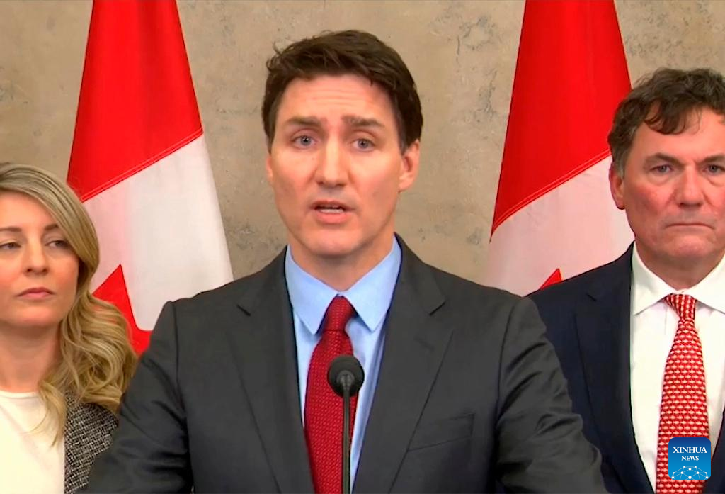 This video screenshot shows Canadian Prime Minister Justin Trudeau (C) speaking to the media in Ottawa, Canada, on Feb. 1, 2025. Canada announced retaliatory tariffs on U.S. imports late Saturday after U.S. President Donald Trump imposed 25-percent tariffs on most Canadian products.