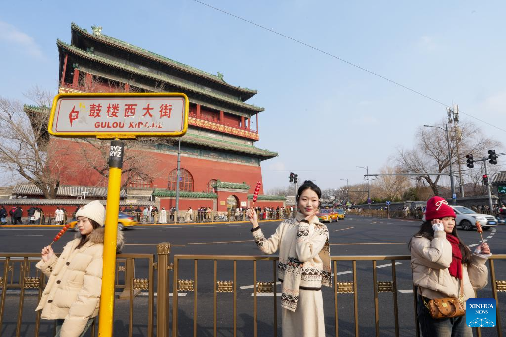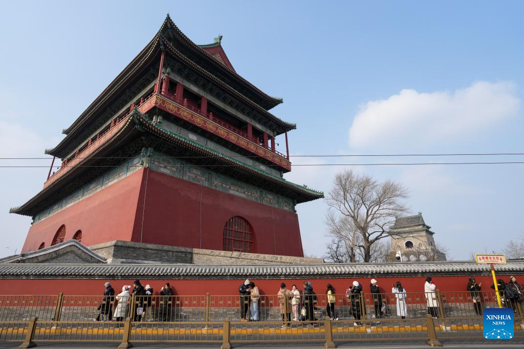 Tourists visit the Drum Tower along the Central Axis in Beijing, capital of China, Jan. 31, 2025. Beijing is now celebrating the first Spring Festival after the United Nations Educational, Scientific and Cultural Organization (UNESCO) inscribed the Beijing Central Axis in its World Heritage List and the Spring Festival in its Representative List of the Intangible Cultural Heritage of Humanity, both in last year.