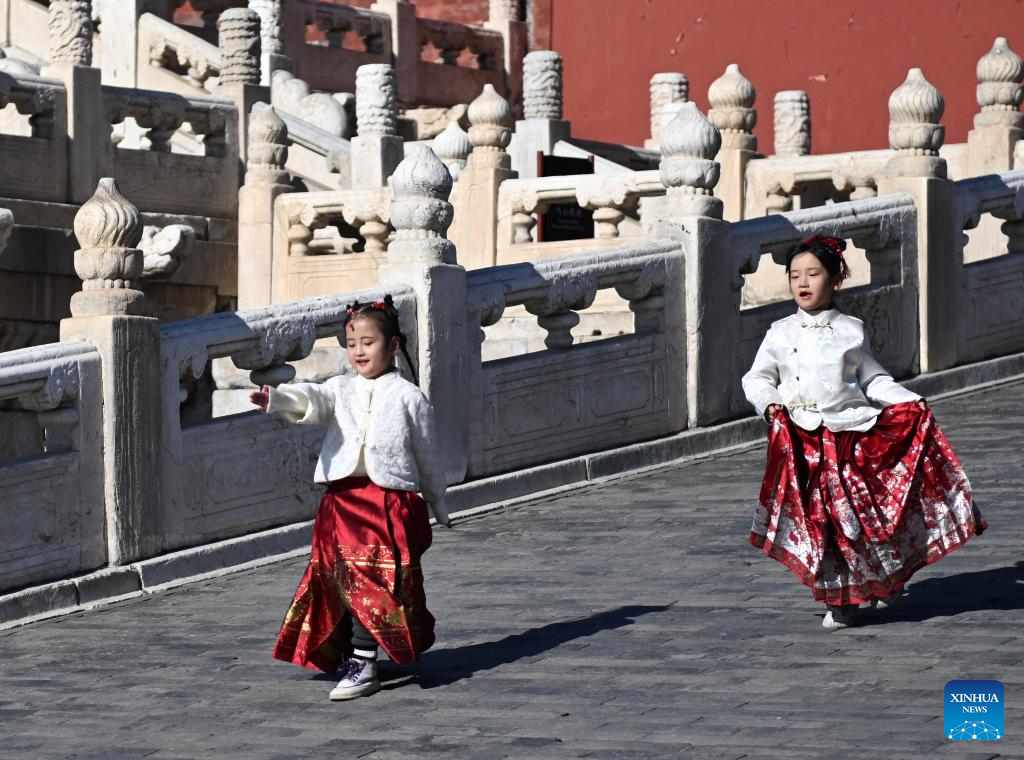Girls play at the Palace Museum along the Central Axis in Beijing, capital of China, Feb. 2, 2025. Beijing is now celebrating the first Spring Festival after the United Nations Educational, Scientific and Cultural Organization (UNESCO) inscribed the Beijing Central Axis in its World Heritage List and the Spring Festival in its Representative List of the Intangible Cultural Heritage of Humanity last year.