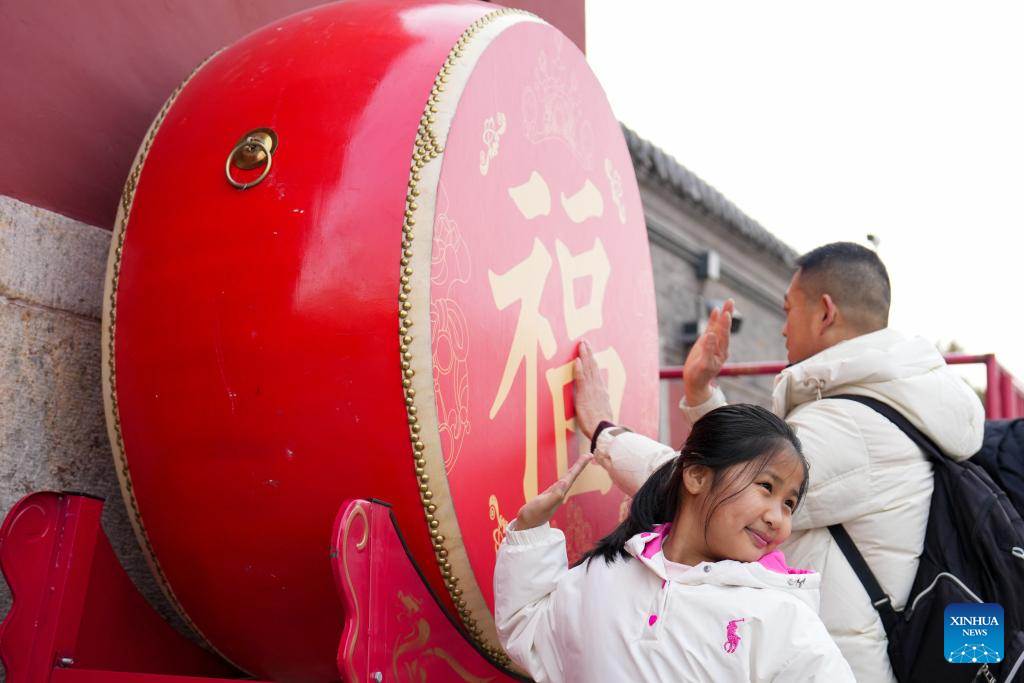 A girl poses for photos with a drum for good fortune under the Drum Tower along the Central Axis in Beijing, capital of China, Jan. 31, 2025. Beijing is now celebrating the first Spring Festival after the United Nations Educational, Scientific and Cultural Organization (UNESCO) inscribed the Beijing Central Axis in its World Heritage List and the Spring Festival in its Representative List of the Intangible Cultural Heritage of Humanity last year.
