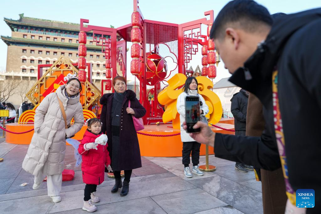 Tourists pose for photos with festive decorations at the Qianmen Street along the Central Axis in Beijing, capital of China, Jan. 29, 2025. Beijing is now celebrating the first Spring Festival after the United Nations Educational, Scientific and Cultural Organization (UNESCO) inscribed the Beijing Central Axis in its World Heritage List and the Spring Festival in its Representative List of the Intangible Cultural Heritage of Humanity last year.
