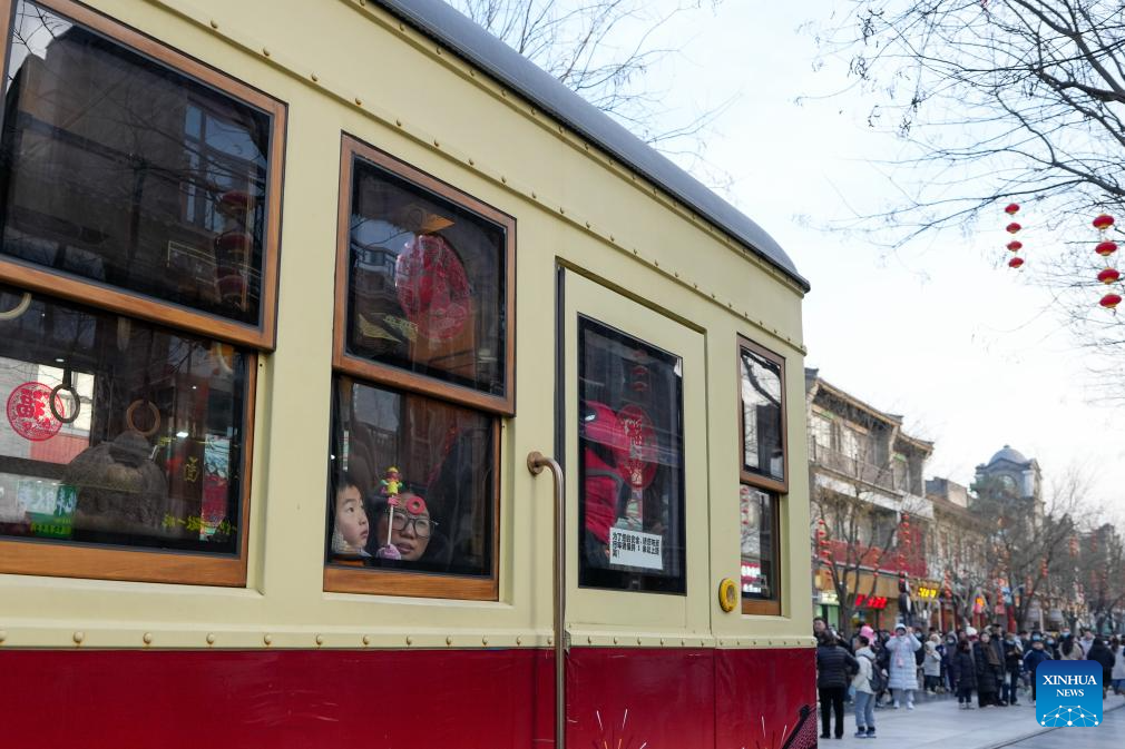 Tourists take a sightseeing tram at the Qianmen Street along the Central Axis in Beijing, capital of China, Jan. 29, 2025. Beijing is now celebrating the first Spring Festival after the United Nations Educational, Scientific and Cultural Organization (UNESCO) inscribed the Beijing Central Axis in its World Heritage List and the Spring Festival in its Representative List of the Intangible Cultural Heritage of Humanity last year.