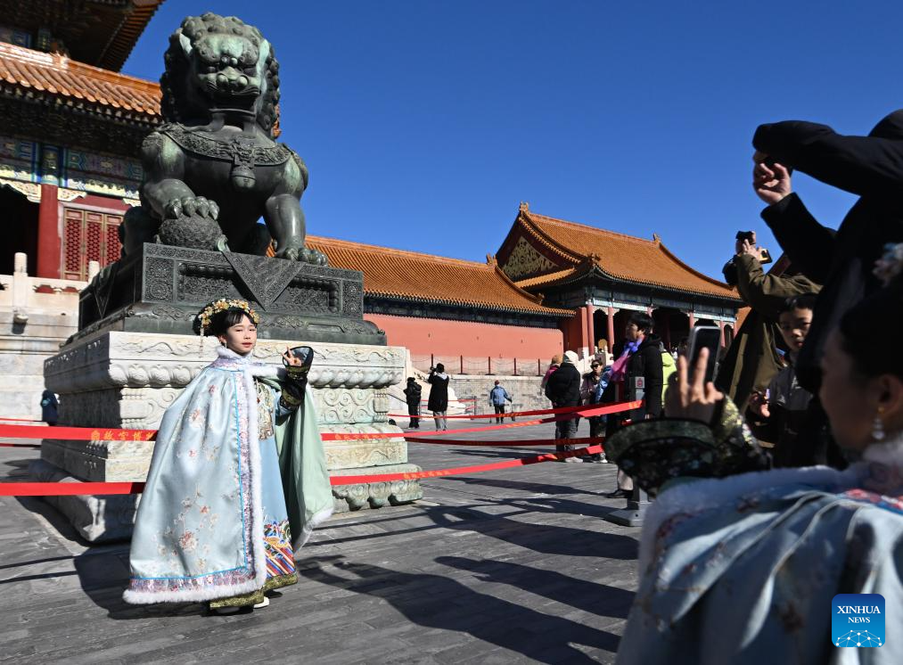 A girl poses for photos at the Palace Museum along the Central Axis in Beijing, capital of China, Feb. 2, 2025. Beijing is now celebrating the first Spring Festival after the United Nations Educational, Scientific and Cultural Organization (UNESCO) inscribed the Beijing Central Axis in its World Heritage List and the Spring Festival in its Representative List of the Intangible Cultural Heritage of Humanity last year.