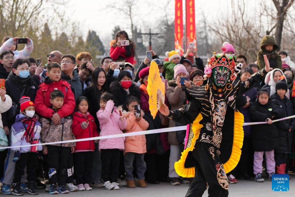 Tourists watch a performance of Sichuan opera stunt "Bianlian," also known as face-changing, at the Jingshan Park in Beijing, capital of China, Jan. 31, 2025. Beijing is now celebrating the first Spring Festival after the United Nations Educational, Scientific and Cultural Organization (UNESCO) inscribed the Beijing Central Axis in its World Heritage List and the Spring Festival in its Representative List of the Intangible Cultural Heritage of Humanity last year.