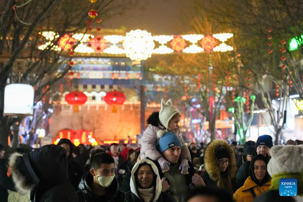 Tourists visit the Qianmen Street along the Central Axis in Beijing, capital of China, Feb. 1, 2025. Beijing is now celebrating the first Spring Festival after the United Nations Educational, Scientific and Cultural Organization (UNESCO) inscribed the Beijing Central Axis in its World Heritage List and the Spring Festival in its Representative List of the Intangible Cultural Heritage of Humanity last year.