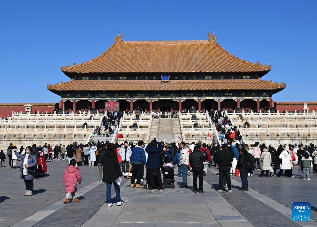Tourists visit the Palace Museum along the Central Axis in Beijing, capital of China, Feb. 2, 2025. Beijing is now celebrating the first Spring Festival after the United Nations Educational, Scientific and Cultural Organization (UNESCO) inscribed the Beijing Central Axis in its World Heritage List and the Spring Festival in its Representative List of the Intangible Cultural Heritage of Humanity last year.