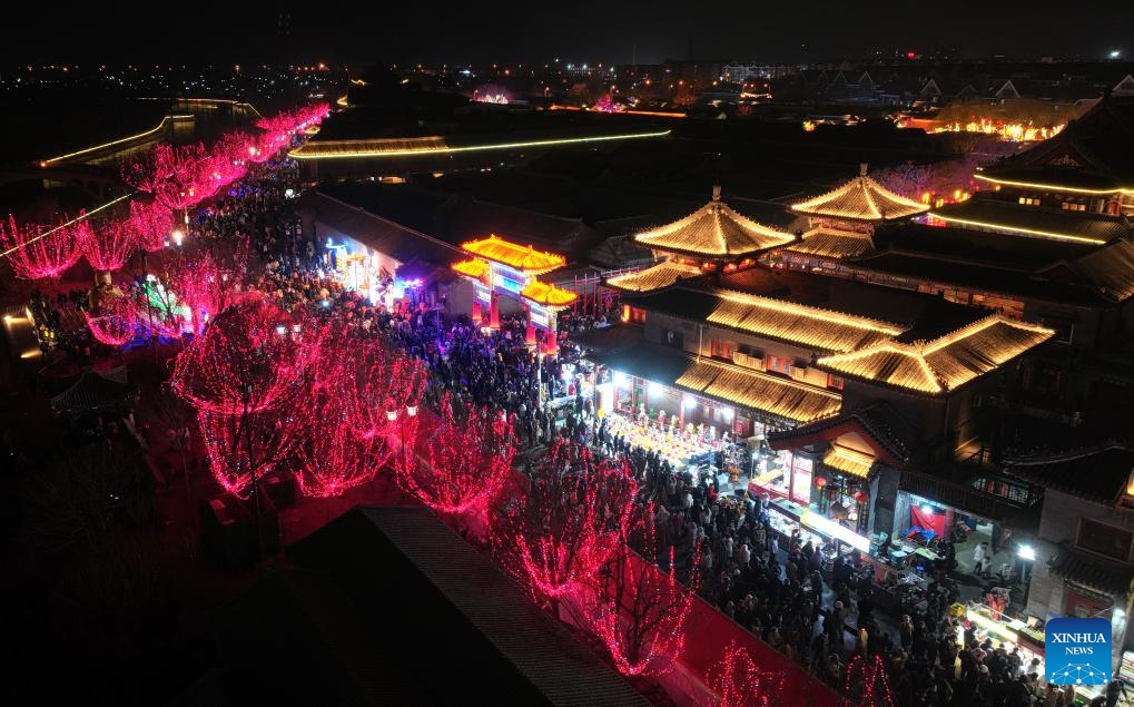 People enjoy the night view at the Yangliuqing ancient town in Tianjin, north China, Feb. 1, 2025. Yangliuqing ancient town is long celebrated for its woodblock new year pictures. These pictures, which usually bear auspicious meanings, flourished during the Ming and Qing dynasties (1368-1911) due to highly developed canal transportation, and were sold to different places in the country.