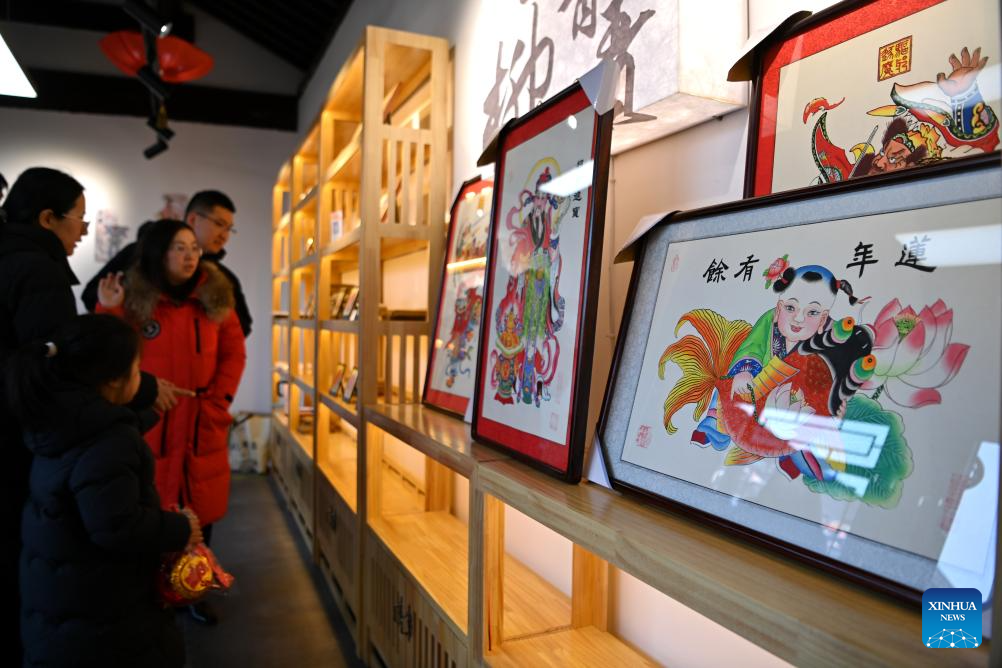 People view woodblock new year pictures at Yangliuqing ancient town in Tianjin, north China, Feb. 2, 2025. Yangliuqing ancient town is long celebrated for its woodblock new year pictures. These pictures, which usually bear auspicious meanings, flourished during the Ming and Qing dynasties (1368-1911) due to highly developed canal transportation, and were sold to different places in the country.