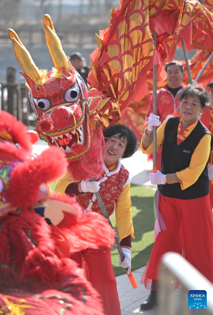 People stage a dragon dance performance at Yangliuqing ancient town in Tianjin, north China, Feb. 2, 2025. Yangliuqing ancient town is long celebrated for its woodblock new year pictures. These pictures, which usually bear auspicious meanings, flourished during the Ming and Qing dynasties (1368-1911) due to highly developed canal transportation, and were sold to different places in the country.