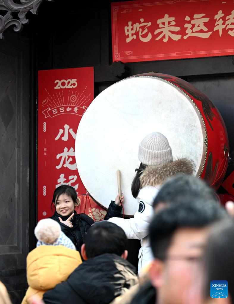 Tourists hit the drum for good fortune at Yangliuqing ancient town in Tianjin, north China, Feb. 2, 2025. Yangliuqing ancient town is long celebrated for its woodblock new year pictures. These pictures, which usually bear auspicious meanings, flourished during the Ming and Qing dynasties (1368-1911) due to highly developed canal transportation, and were sold to different places in the country.