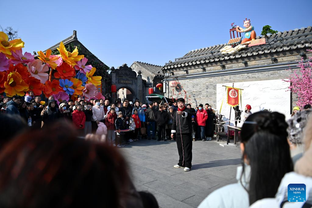 A magician performs at Yangliuqing ancient town in Tianjin, north China, Feb. 2, 2025. Yangliuqing ancient town is long celebrated for its woodblock new year pictures. These pictures, which usually bear auspicious meanings, flourished during the Ming and Qing dynasties (1368-1911) due to highly developed canal transportation, and were sold to different places in the country.