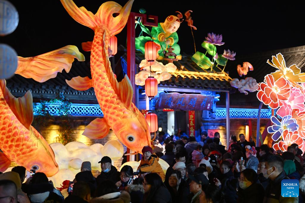 People visit a festive lantern show at the Yangliuqing ancient town in Tianjin, north China, Feb. 1, 2025. Yangliuqing ancient town is long celebrated for its woodblock new year pictures. These pictures, which usually bear auspicious meanings, flourished during the Ming and Qing dynasties (1368-1911) due to highly developed canal transportation, and were sold to different places in the country.
