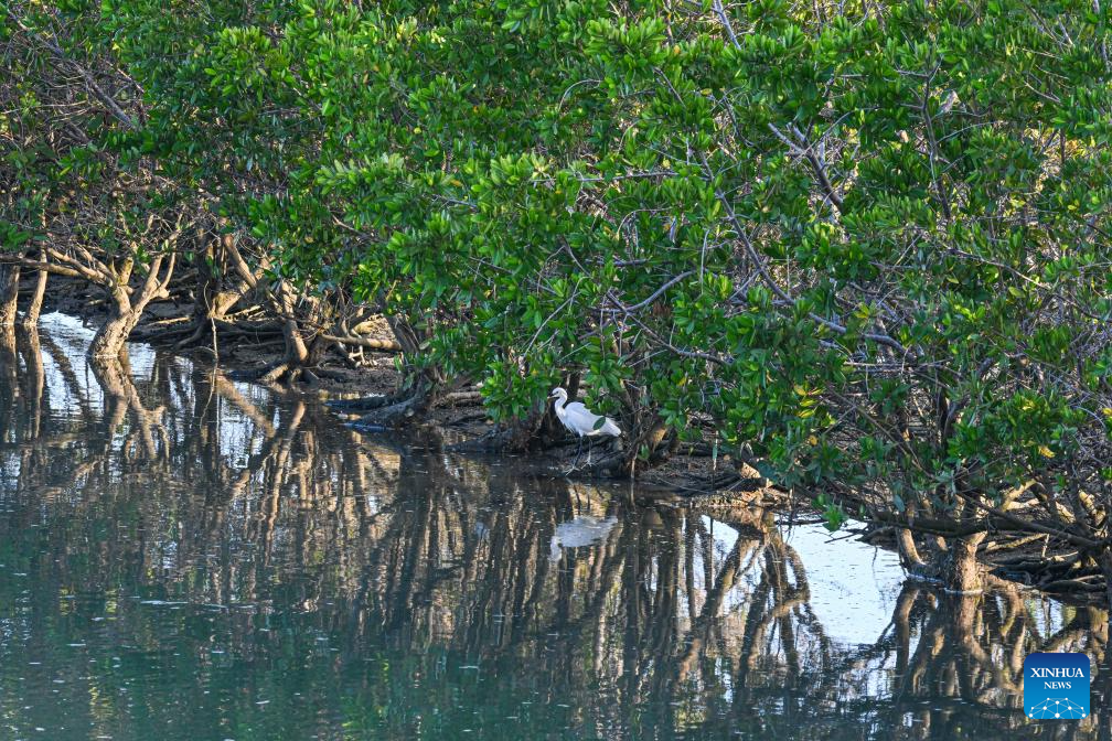 An egret is pictured among mangroves at the Hainan Lingshui Mangrove National Wetland Park in south China's Hainan Province, Jan. 31, 2025. Home to thousands of waterfowl, the park covering 958.22 hectares has resulted from uncompromising efforts of the local authorities since 2016 to restore and protect the mangrove ecological systems. (Xinhua/Pu Xiaoxu)