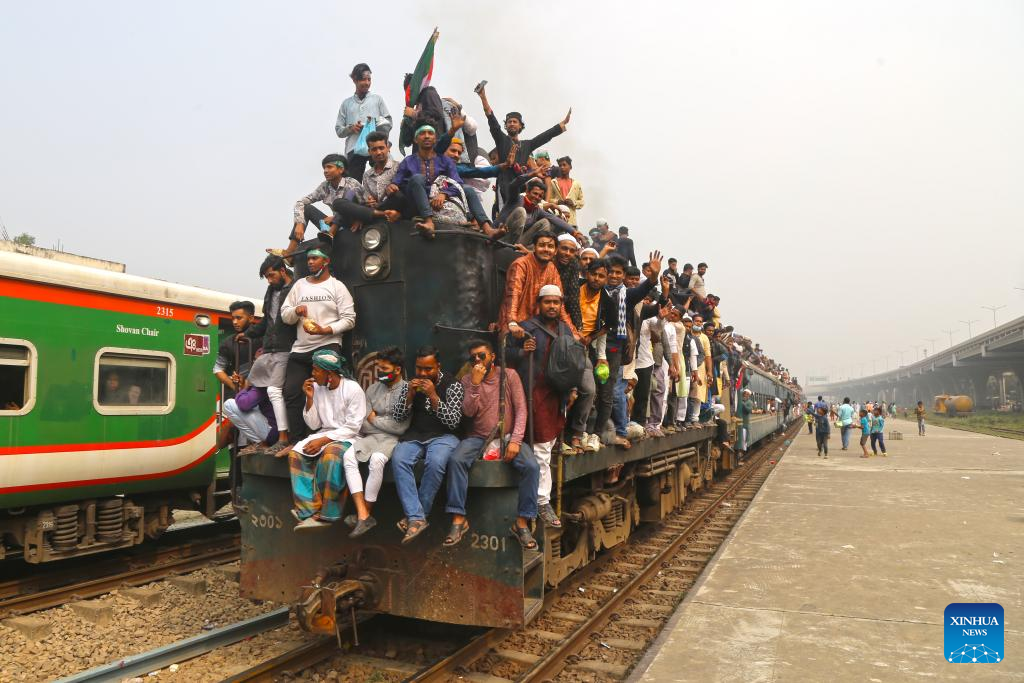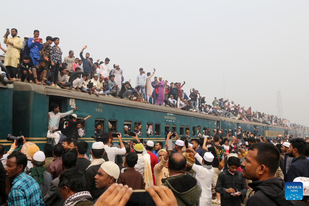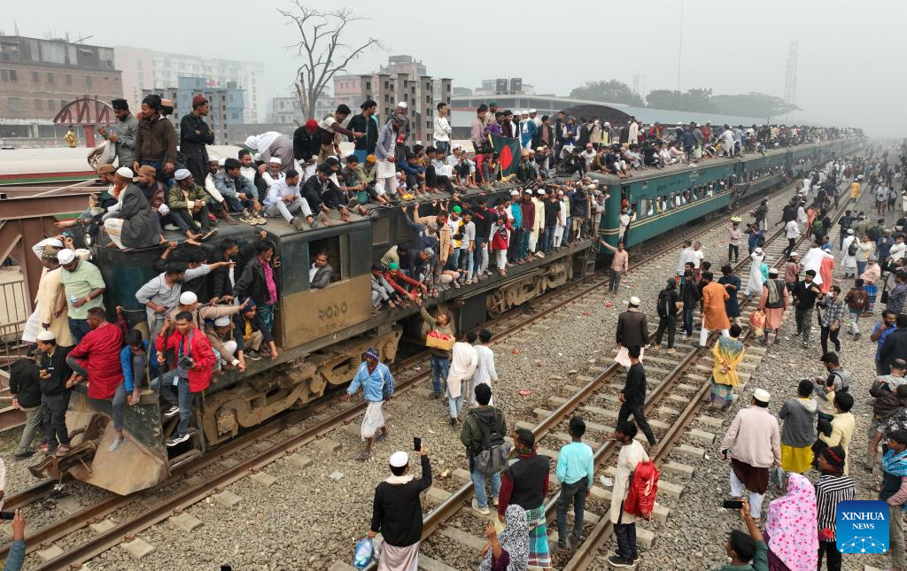 Devotees climb on an overcrowded train to return home after attending the annual Muslim congregation Bishwa Ijtema in Tongi on the outskirts of the Bangladeshi capital Dhaka, Feb. 2, 2025. (Xinhua)