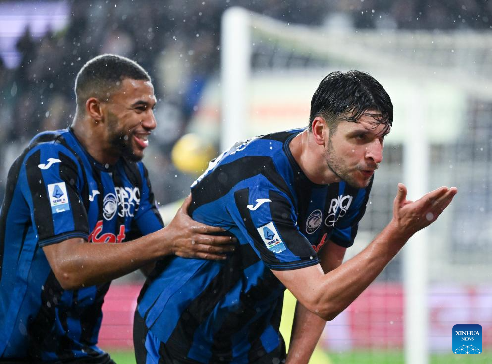 Atalanta's Berat Djimsiti (R) celebrates his goal with his teammate Rafael Toloi during a Serie A football match between Atalanta and Torino in Bergamo, Italy, Feb. 1, 2025. (Photo by Alberto Lingria/Xinhua)
