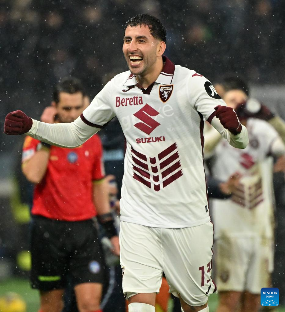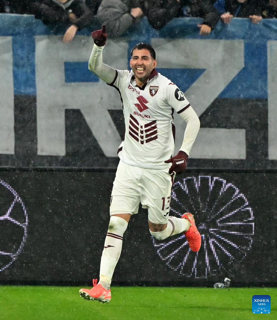 Torino's Guillermo Maripan celebrates his goal during a Serie A football match between Atalanta and Torino in Bergamo, Italy, Feb. 1, 2025. (Photo by Alberto Lingria/Xinhua)